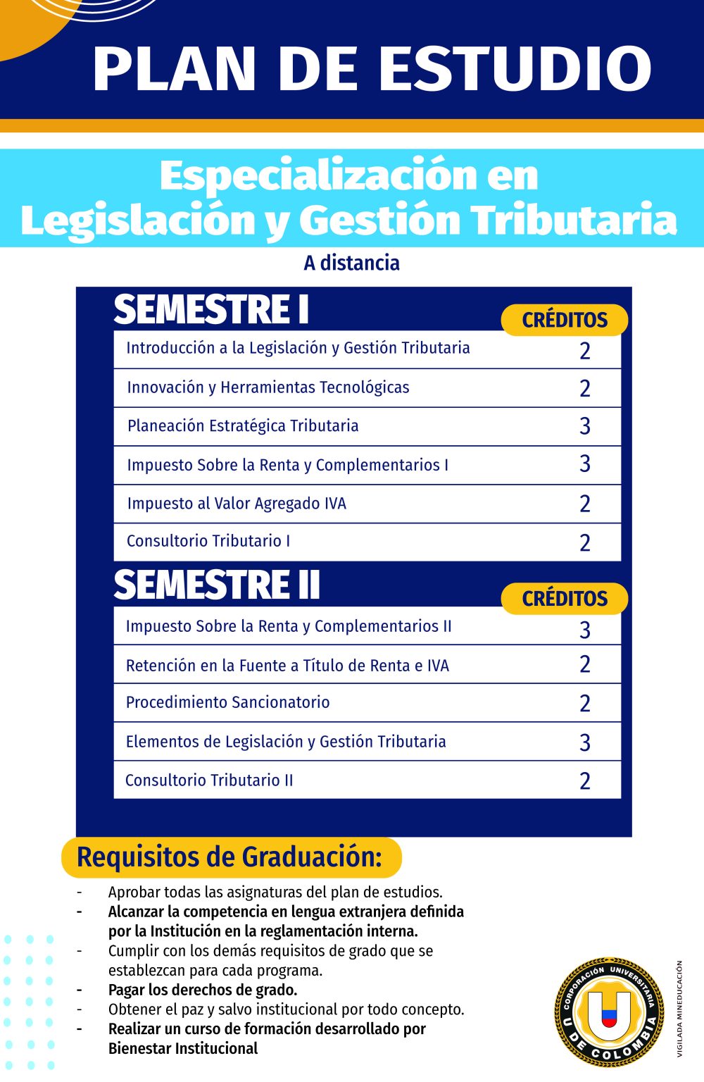 El Especialista en Legislación y Gestión Tributaria de U DE COLOMBIA, crea, ejecuta, controla y dirige planes o proyectos tributarios, de entidades públicas y privadas, bajo los principios de equidad, progresividad, eficiencia y retroactividad en los diferentes impuestos que integran el sistema tributario colombiano, desarrollando competencias para abordar, analizar, argumentar, intermediar y asesorar casos litigiosos en asuntos fiscales.
