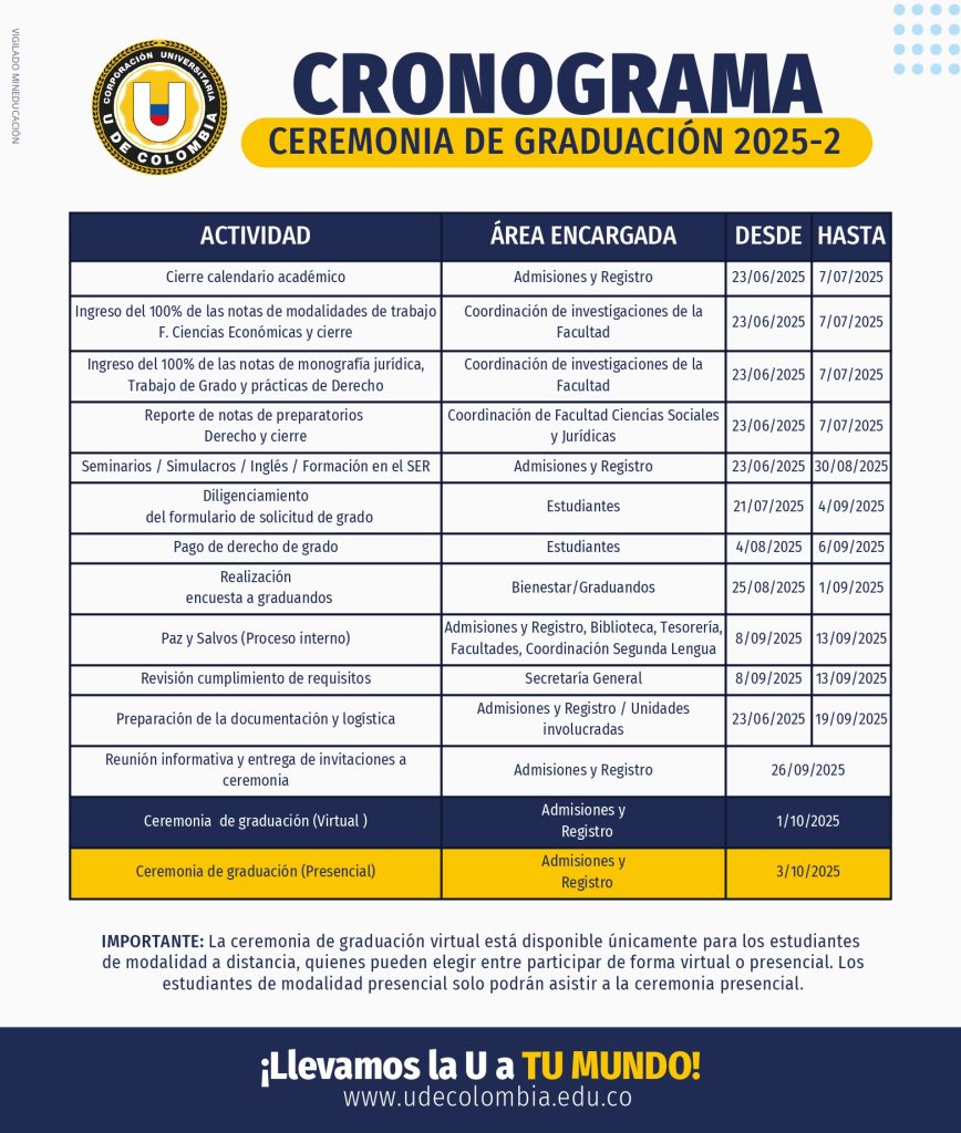 | Ceremonia de graduación (Presencial) | Admisiones y Registro | 3/10/2025 |
